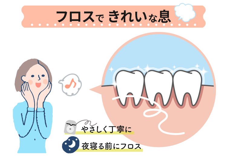 虫歯・歯周病ではなく、食べかすや歯垢が原因の場合は継続的にフロスを使用することでにおいがなくなることもあります。 フロスには様々な種類があります。歯の場所によって使い分け、使いやすいフロスをつかって、最低でも1日1回は行いましょう。